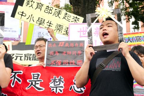 The TGEEA was joined by members from the Taiwan Tongzhi Hotline Association, the Taiwan Adolescent Association on Sexualities, the Gender/Sexuality Rights Association Taiwan and the Tong-Kwang Light House Presbyterian Church in a demonstration outside the Ministry of Education before heading to the prosecutors’ office.