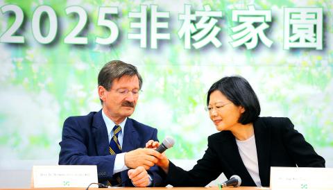 Tsai, who recently returned from Germany, has trumpeted her “2025 nuclear-free homeland” plan, which aims to gradually shut down Taiwan’s three existing nuclear power plants and stall operations at a fourth, currently under construction in New Taipei City (新北市).