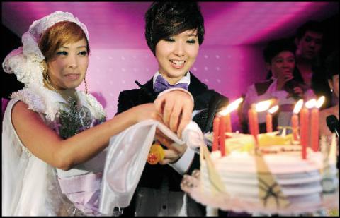 Many of the couples donned white dresses and veils for the “Barbie and Barbie’s wedding,” which was held overnight in downtown Taipei, attracting about 1,000 visitors, including friends, relatives and curious onlookers.