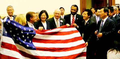 Representative Ileana Ros-Lehtinen, chairman of the House of Representatives Foreign Affairs Committee, heaped praise on Tsai and presented her with a US flag that had been flown earlier in the day over the Capitol building as members rushed forward to be photographed with her.