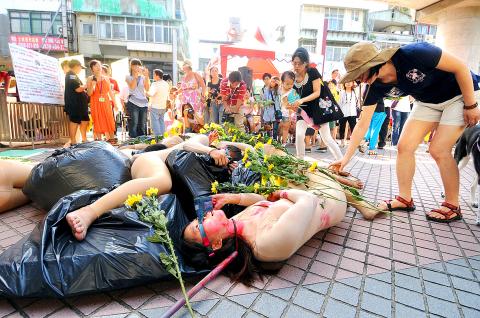 Students from several universities’ animal protection clubs also performed a skit in which they wore skin-colored tights with red ink on them and lay on stacks of garbage bags on the ground after mimicking how dogs at animal shelters were put to death.