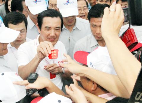 Countering the craze for piggy bank donation boxes among Democratic Progressive Party (DPP) supporters, President Ma Ying-jeou (馬英九) yesterday handed out 5,000 talismans to the public as his re-election campaign opened its regional campaign headquarters in Nantou County.