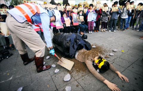 Shouting slogans urging the Department of Rapid Transit Systems (DORTS) to halt construction and holding placards that read “Losheng SOS,” the demonstraters rallied as their representatives entered the Control Yuan to submit the petition.