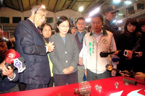 The DPP chairperson visited the Youth Industrial Park in Taoyuan County on the second day of her five-day campaign visit to local industrial centers, which she said was arranged to “listen to the voices of local business leaders.”