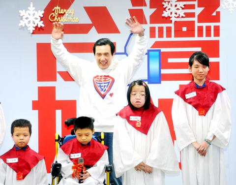 Wearing a white hooded sweatshirt and a pair of jeans, Ma spent the afternoon with a group of young supporters at his campaign headquarters in Taipei City, giving out red talismans, one of his campaign souvenirs, and singing Christmas carols with children who suffer from rare diseases.