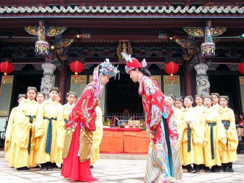 While many couples opt for a church wedding and wedding party with lots of music and fanfare, a Japanese groom and Taiwanese bride yesterday tied the knot in a traditional Confucian wedding in Taipei, calling for a revival of the centuries-old Chinese practice.