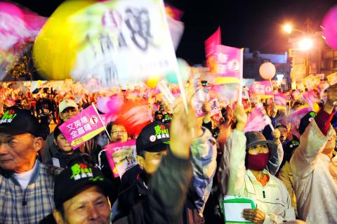 Tsai began the final phase of the campaign in Pingtung County, where she is from, yesterday, visiting the townships of Manjhou, Hengchung (恆春), Neipu (內埔) and Donggang (東港).