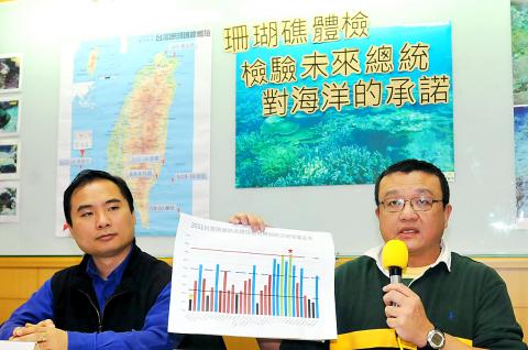 Following three years of studies on the health of Taiwan’s coral reefs, the non-profit Taiwan Environmental Information Association yesterday said the ocean ecology surrounding Taiwan was threatened by overfishing and urged the three presidential candidates to enforce ocean protection policies.