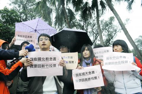 Dozens of college students yesterday rallied outside National Taiwan University (NTU), calling on the government to provide assistance with transportation so they can return home to vote on Jan. 14, as election day falls in the final week of exams for many students.