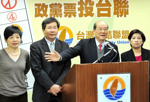 TSU Chairman Huang Kun-huei (黃昆輝) introduced Hsu Chung-hsin (許忠信), Huang Wen-ling (黃文玲) and Lin Shih-chia (林世嘉), who will be sworn in on Feb. 1. The party garnered 1.17 million party votes in the elections on Saturday, passing the 5 percent threshold and winning three legislator at-large seats.