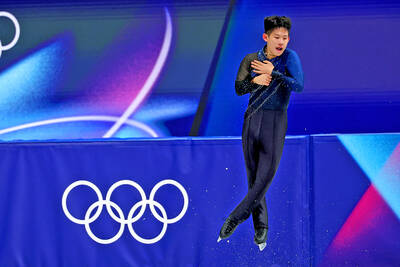 Taiwan’s Li Yu-hsiang performs in the men’s singles figure skating short program at the Milano-Cortina Winter Olympics, in Milan, Italy, on Tuesday. Li finished 24th with a score of 72.41 to advance to Saturday’s free skate portion of the event. He is the first Taiwanese to qualify for the free skate of men’s singles figure skating at the Olympics since David Liu in 1992.