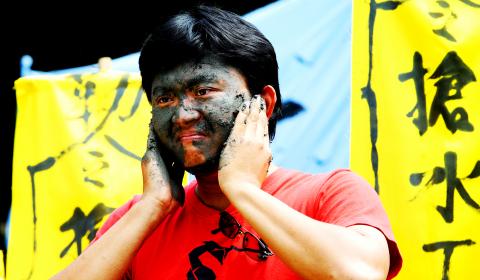 The faces of the young activists and the mostly elderly farmers were smeared with mud from Jhuoshuei River (濁水溪), a major water source in the Changhua area. They said it symbolized the river water and the mud that have accompanied their growth and ageing, in contrast to the “water-jacking” project that would deprive them of their livelihoods.