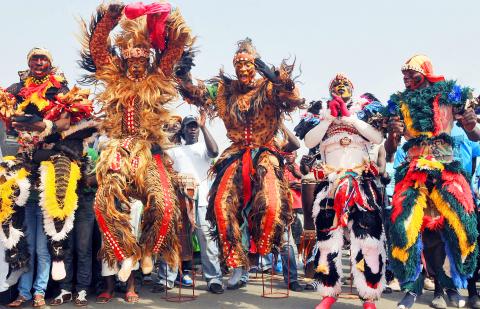 The red-carpet ceremony at Banjul airport began with a review of an honor guard and the playing of the national anthems of both countries. They were followed by traditional singing and dancing by thousands of performers lined up on either side of the red carpet.