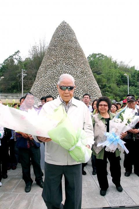 Accompanied by Kaohsiung Mayor Chen Chu (陳菊) and a group of residents, Lee toured the park and presented bouquets in front of a pyramid-shaped stone memorial.
