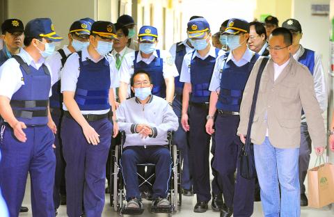 Chen’s son, Chen Chih-chung (陳致中), and daughter, Chen Hsin-yu (陳幸妤), went to the hospital, but they were barred from accompanying their father during the medical exam.