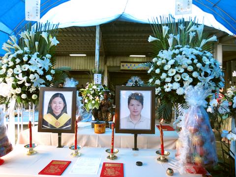 Bereaved parents yesterday held a posthumous ghost wedding in Greater Taichung’s Dongshih District (東勢) for their beloved daughter and son, a young couple killed last week by a mudslide caused by torrential rain.