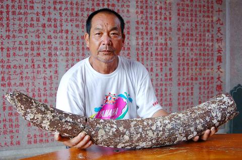 The rare fossilized ivory tusk was snagged in a net at about 200m depth in the sea off eastern Dongji Island by Wang Chiu-tang (王秋堂), from Greater Tainan’s Annan District (安南) earlier this year.