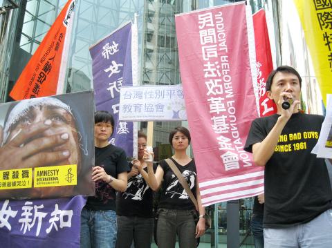 Led by Amnesty International Taiwan, several human rights groups, including the Taiwan Labor Front, the Taiwan Association for Human Rights, the Garden of Hope Foundation and the Awakening Foundation, gathered in front of the Aurora Building, where the Representative Office in Taipei for the Moscow-Taipei Coordination Commission on Economic and Cultural Cooperation — the de facto Russian embassy — is located, and called attention to the bloodshed in Syria.