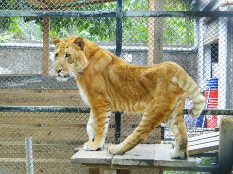 Nicknamed A-piao (阿彪), the animal is the only survivor of three liger cubs born on Aug. 15, 2010, to a tigress that was illegally mated with a lion at a privately run leisure farm in Tainan, the shelter’s manager Kurtis Pei (裴家騏) said.