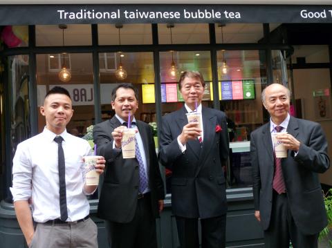A ribbon-cutting ceremony was held to celebrate the grand opening of Chatime’s first outlet in the UK, which was attended by Taiwan’s representative to the UK Shen Lyu-shun (沈呂巡) and Harry Liang (梁秋生), chairman of the Taiwanese Chamber of Commerce in England.