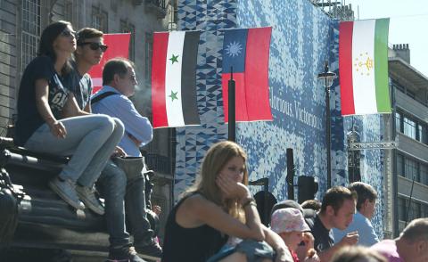 The national flags were positioned in alphabetical order, with six flags in a line. The ROC flag was hung with the flags of Switzerland, Syria, Tajikistan, Tanzania and Thailand, before it was removed on Tuesday, leaving the slot vacant.