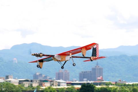 Under the midday sun at the His Sheng Remote Control Aircraft Park in New Taipei City’s (新北市) Sinjhuang (新莊) yesterday, the UAV took off on an airstrip as the research team piloted it by remote control. It flew at an average speed of 34km per hour, circled in the sky a few times and made a slightly rough landing that caused minor damage to one of its tires.