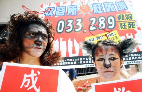 More than 1.25 million stray animals have been caught and put into public animal shelters during the past 13 years, but as much as 82 percent of them have been put to death or died in the shelters because of insufficient regulations, animal rights activists said at a demonstration in Taipei yesterday.