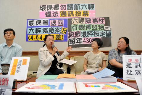 Taiwan Water Resources Protection Union and the Changhua Medical Alliance for Public Affairs made the remarks at a press conference co-hosted by Democratic Progressive Party lawmakers Liu Chien-kuo (劉建國) and Tien Chiu-chin (田秋堇), urging the Environmental Protection Administration (EPA) not to proceed with a vote-by-mail decision process on a re-evaluation of the environmental impact assessment (EIA) for the naphtha cracker’s expansion project.