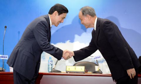 In a farewell luncheon, he thanked Ma for giving him the opportunity to “make history” by presiding over the eight rounds of cross-strait negotiations and completing the signing of 18 cross-strait agreements, including the Economic Cooperation Framework Agreement (ECFA).