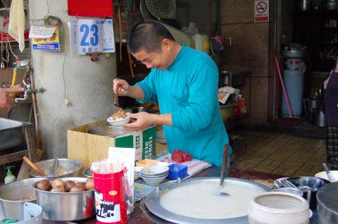 Yeh took up the family business, adding his own special recipe. Yeh uses thin noodles as the main ingredient, embellishing them with braised egg whites, marinated minced pork and soup stock from slowly stewing hog bones. In his estimation, only a profit of about NT$3 is usually made from each bowl. Now, amid rising commodity prices, a bowl will yield a profit of only NT$1 at the most.