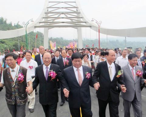 The bridge’s opening was also witnessed by Morakot Post-Disaster Reconstruction Council chief executive Chern Jenn-chuan (陳振川), Deputy Kaohsiung Mayor Liu Shih-fang (劉世芳), Straits Exchange Foundation Chairman Lin Join-sane (林中森) and ARATS Vice Chairman Zheng Lizhong (鄭立中).