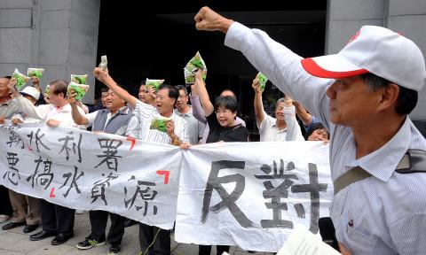 Environmentalists and farmers from Pingtung County and Greater Kaohsiung yesterday staged a protest against the Gaoping Great Lakes (高屏大湖) project, which they fear would divert water used for farming and damage local soybean production.