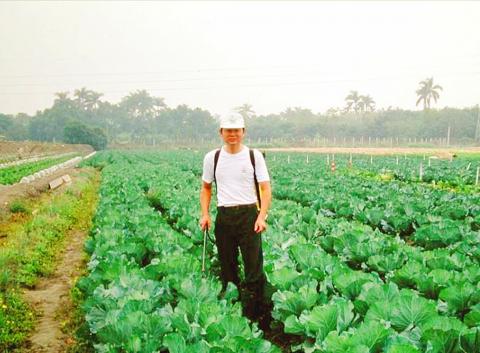 Showing a picture of himself spraying the pesticide in a cabbage farm without wearing a gas mask and gloves, COA Taiwan Agricultural Chemicals and Toxic Substances Research Institute (TACTRI) researcher Tseng Ching-chou (曾經洲) said the new pesticide was toxic to the Lepidoptera order of insects, which includes moths and butterflies, but does not affect other animals.