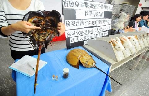 After conducting an investigation of 25 local pharmaceutical companies between 2006 and this year, the Environment and Animal Society of Taiwan (EAST) said it found that all 25 firms did animal testing — 18 companies used rabbits for pyrogen testing, while seven companies used horseshoe crabs for Limulus amebocyte lysate (LAL) testing.