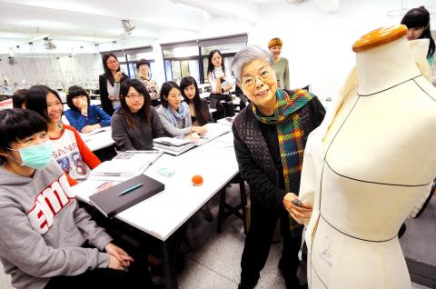 In a classroom used by the Shih Chien University’s Fashion Design Department, the 82-year-old Hung Su-shin (洪素馨) stared intently at a mannequin, and then, with a few swift stitches, transformed the loose cloth hanging on the mannequin into the sleeve and collar of a shirt. The students watched closely, with some occasionally taking pictures or recording the process on their mobile phones.