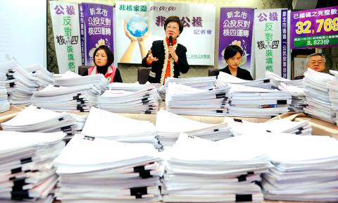 “If more than 100,000 people signed the petition, Ma would be obligated to publicly explain his policy,” Lu, who had initiated an anti-nuclear referendum in New Taipei City (新北市), told a press conference.