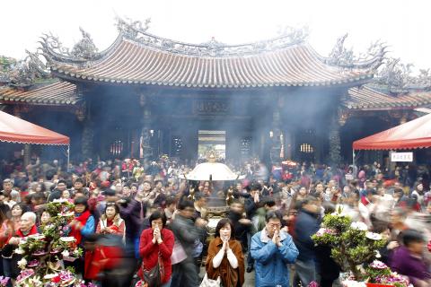 Thousands of people packed the outdoor square of Taipei’s Xingtian Temple (行天宮) before the clock struck midnight, waiting to race to the incense burner or simply to witness the spectacle.