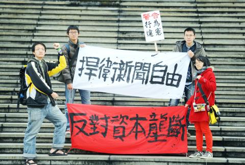 The Youth Alliance Against Media Monsters, made up of mostly students, has since staged many protests — demonstrating in front of the CtiTV building, staging an all-night sit-in in front of the Executive Yuan and holding a New Year’s Eve rally at the Liberty Plaza — calling on the government to prevent overconcentration of media ownership in the hands of a few.