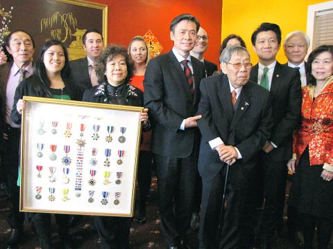 On behalf of President Ma Ying-jeou (馬英九) and Air Force Chief of Staff Major General Liu Chen-wu (劉震武), King and Li presented gifts to wish the retired hero continued longevity and good health.