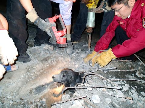 A dog trapped in a drainage pipe underneath a 200-year-old house in Pingjhen City (平鎮), Taoyuan County, was rescued on Feb. 28 after firefighters “received permission” from the property owner’s ancestors to excavate the ground by casting divination blocks.