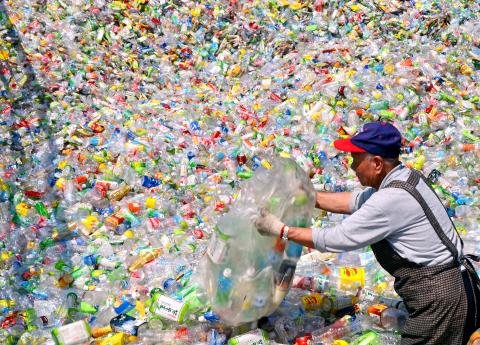 About 40 people stand ankle-deep in used plastic bottles in the yard of a recycling station in Taipei, stamping them flat in the first step of a process that will transform the junk into usable goods.