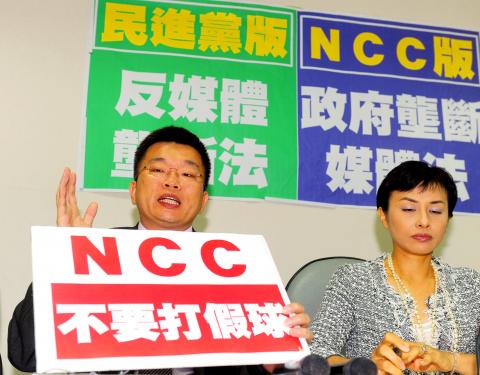 At a press conference, the DPP caucus condemned the KMT caucus for returning the DPP’s draft anti-media monopoly bill to the Procedure Committee yesterday and the National Communications Commission (NCC) for failing to abide by a legislative resolution to submit a draft in time.