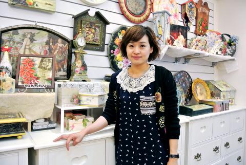 “Household items can become works of art,” home decor artist Huang Ssu-wei (黃思維) said as she used decoupage techniques to cover notebooks, chairs and tables with cutouts of decorative napkins and colored wrapping paper, turning old items into works of art.