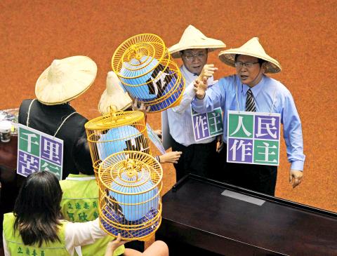 DPP lawmakers placed several placards in bird cages with the name of the Referendum Act (公民投票法) in Chinese characters to highlight the flaws in the legislation, one of which was the required turnout of at least half of the electorate for a national referendum to be considered valid.