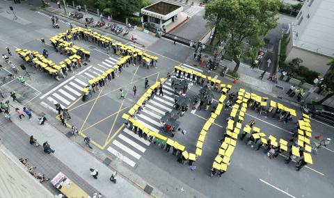 About 300 people held up two-sided yellow and black boards to form the English word “Stop” in front of the legislature in Taipei yesterday afternoon to protest against the proposed national referendum on the construction of the Fourth Nuclear Power Plant in Gongliao District (貢寮), New Taipei City (新北市), that is likely go to a second vote this week.