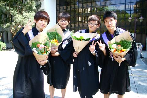 Meanwhile, graduates at National Tsing Hua University (NTHU) in Hsinchu City decided to “go green” on their graduation day, using pedal-powered LED lights and a “green tunnel” made of twigs, cones and fallen leaves as decorations for their ceremony.