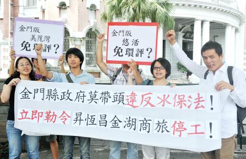 Members of the Wuchiang River Protection Union from Kinmen held a demonstration in front of the Control Yuan in Taipei yesterday and filed a complaint with the government watchdog asking it to investigate and stop the construction of a hotel next to the Taihu Reservoir, an important water source for the outlying island.