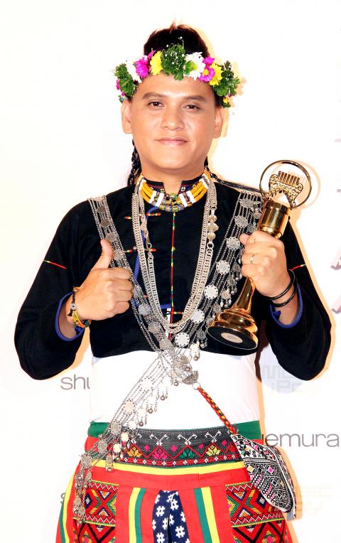 Best Aboriginal Singer Award winner Sangpuy (盧皆興) asked other nominees to join him on stage with hand-held signs bearing messages such as “Protect the eastern coastline,” “Against nuclear power and nuclear waste” and “Refuse illegal development.”
