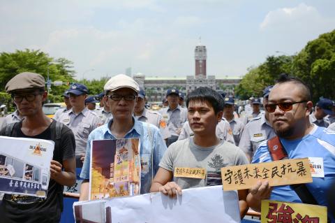 The protest took place following the arrest of National Chengchi University professor Hsu Shih-jung (徐世榮) and another protester on Wednesday, when they joined other supporters of the demolished house owners in staging a demonstration outside the Ministry of Health and Welfare in Taipei during a visit by President Ma Ying-jeou (馬英九).