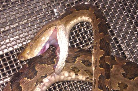 A pointed-scaled pit viper was found dead with its fangs stuck inside its body one day after it was captured and caged by firefighters from Nantou County’s Guosing Township (國姓), raising questions whether it committed suicide because of its captive environment.